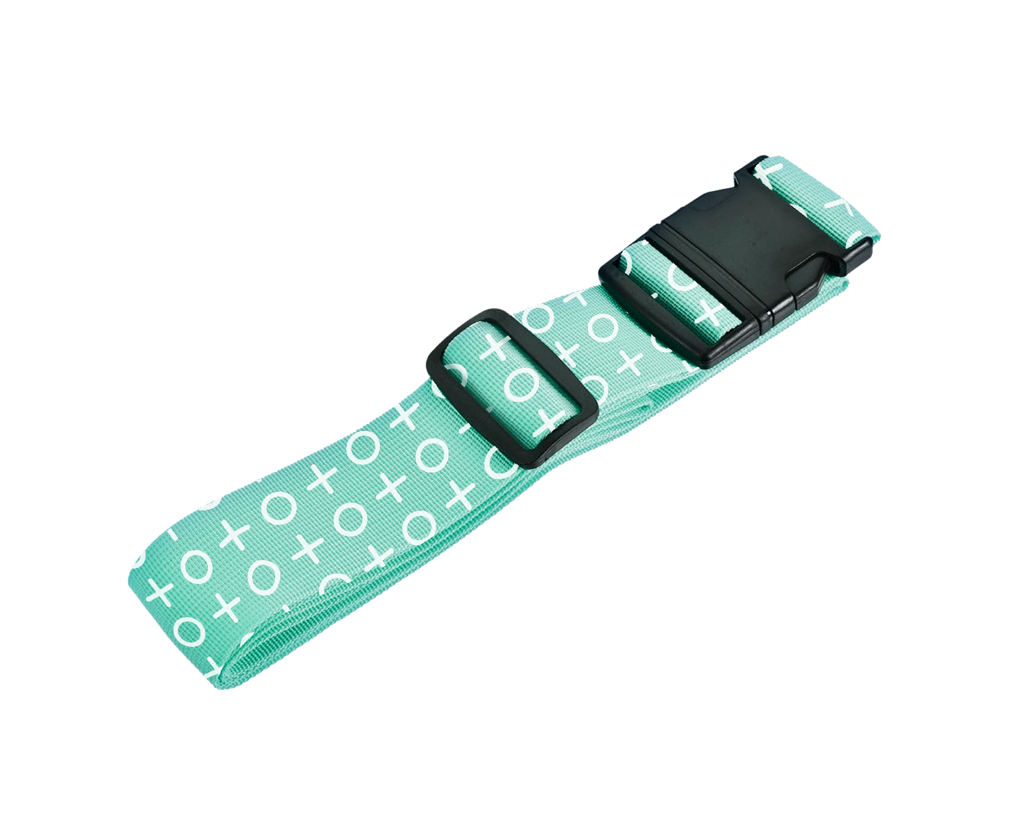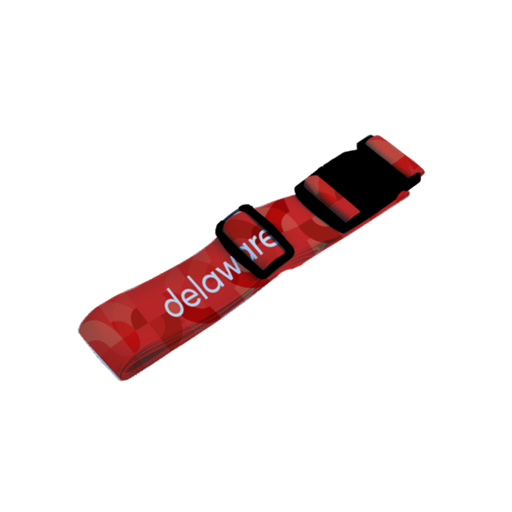 This sustainable luggage belt is crafted from recycled PET with eco accessories. It measures 190 cm × 40 mm and features vibrant full-color CMYK sublimation printing. Includes adjustable buckle and optional biodegradable packaging.