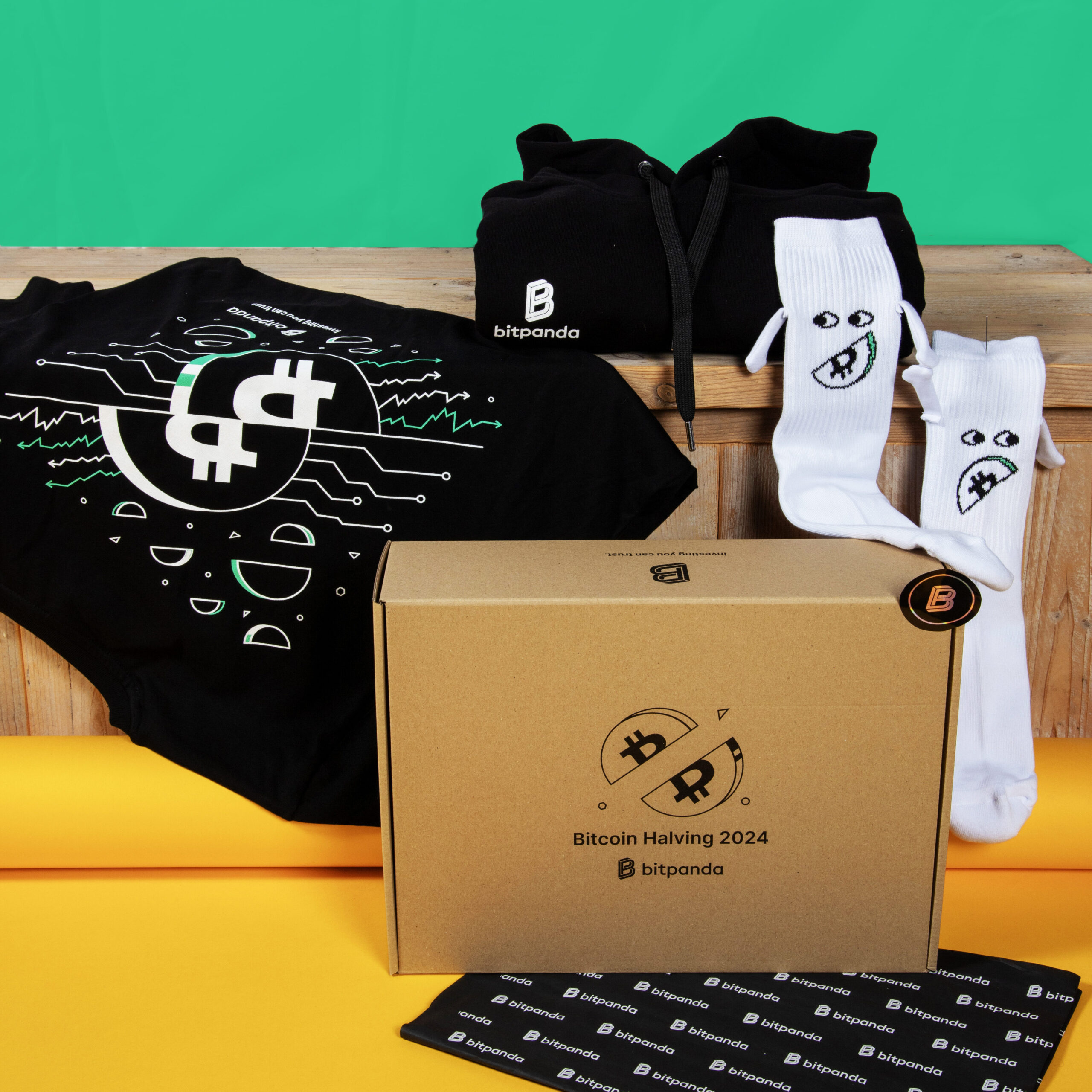 This themed kit celebrated the Bitcoin Halving 2024 with flair. It featured a black event t-shirt with bold graphics, a cozy hoodie, socks and a sticker all packed in a sleek custom box. The perfect balance of hype, community, and comfort.