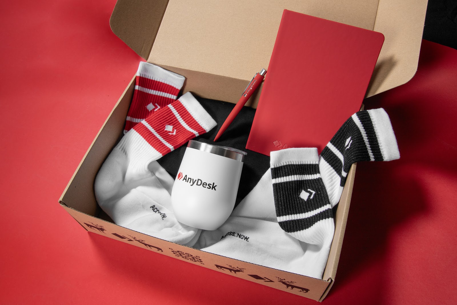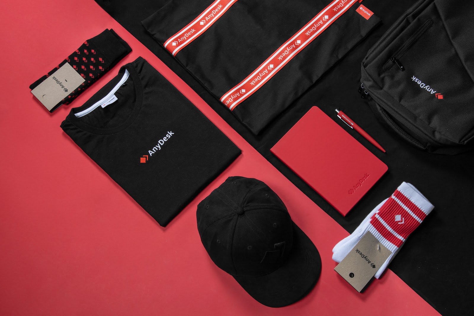 We also made a more comprehensive kit. This expanded set included a black branded t-shirt, a bold black cap, red and black socks with subtle logo detailing, a red notebook and pen combo, and a second set of striped socks to round it out. But what really stood out was the custom backpack and laptop sleeve, both subtly branded and finished with red accents for a cohesive look. Everything was tied together with premium packaging and a clear red-and-black brand story. This kit was built for real, daily use: from the office to the road, while making sure the AnyDesk identity was present at every touchpoint. It’s a perfect example of swag that feels elevated and intentional, rather than just promotional.