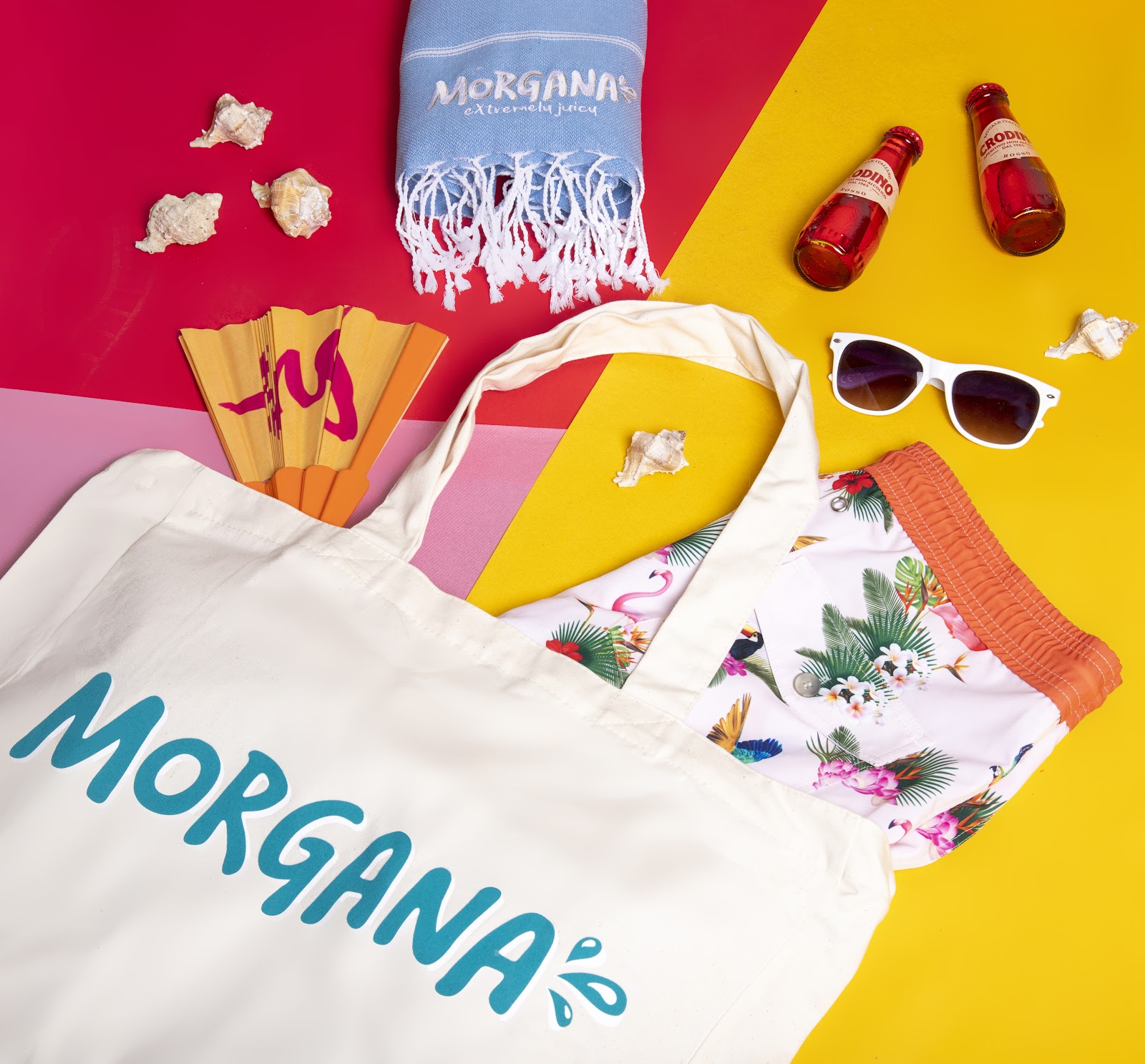 This summer kit for Morgana was designed to radiate fun, freshness, and bold brand personality. Packed in a branded tote bag, it included tropical swim shorts, stylish white sunglasses, a vibrant beach fan, a light blue towel with logo embroidery and two bottles of fruity drinks. Bright colors and playful elements made this kit the ultimate companion for a sunny getaway or a seasonal campaign. It’s a perfect example of how branded merch can feel like a gift, not just swag.
