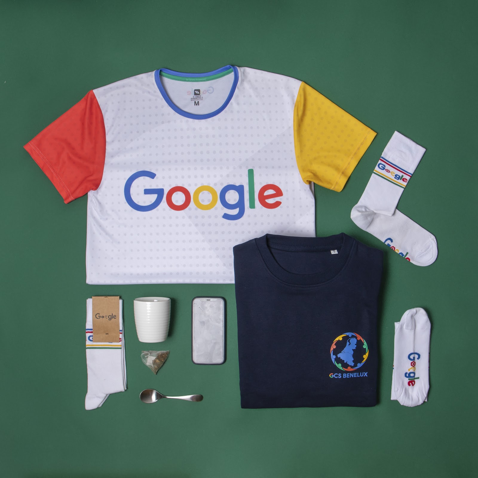 A warm and versatile kit created for Google’s GCS Benelux team. It included a t-shirt and a sweater, one playful and Google-branded, the other team-specific, along with white socks and a mug. The result was a hybrid between team merch and daily essentials.