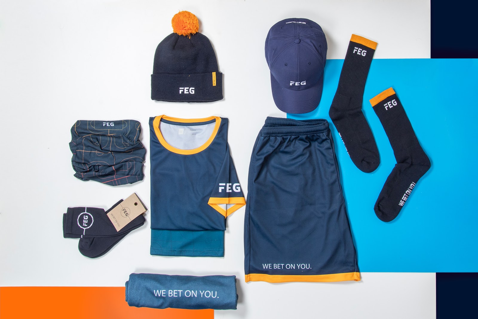 FEG’s kit was built for movement and motivation, featuring custom t-shirts, shorts, socks, a cap, beanie, and neck gaiter, all designed around their bold slogan “We Bet on You.” The look was dynamic, team-focused, and ready for any sports event.