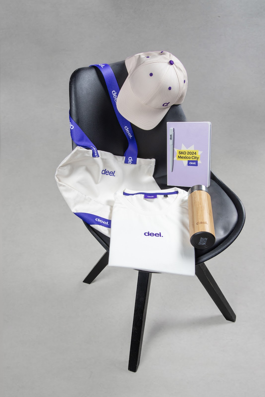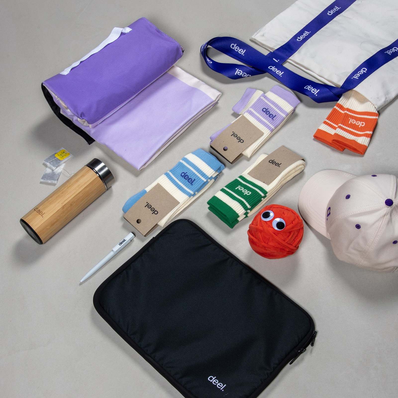 We also created a second kit for Deel, this time focused on swag and brand engagement. It was a colorful, feel-good merch pack featuring an explosion of Deel-branded socks in every color of the rainbow, a soft picnic blanket, a bamboo bottle, a tote bag, a cap and a pen. Designed to spark smiles and shareability, this kit kept the energy high and the brand front of mind long after the event wrapped.
