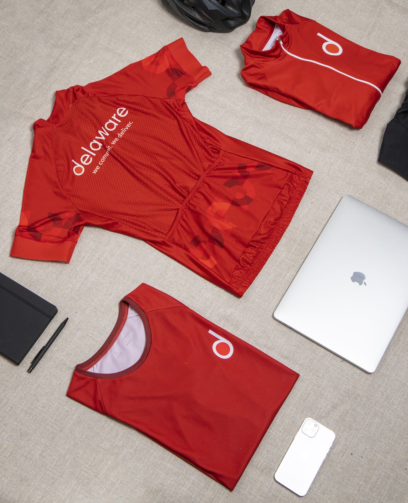 Delaware’s kit took a cyclist’s approach, with sleek red cycling outfit and subtle branding. The line “we commit. we deliver.” on the back tied the company’s identity directly to action on and off the road.