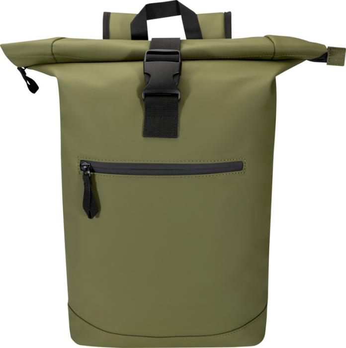 Elevate your brand with this 15” Recycled Roll‑Top Backpack, a perfect balance of sustainability and contemporary design. Crafted from GRS-certified recycled PU leather with color-matched RPET lining, it’s both stylish and eco-conscious. The water-resistant finish keeps belongings safe, and the roll-top closure offers flexible storage capacity, making it ideal for commuting, travel, or daily use. With its minimalist profile, this backpack also serves as a clean canvas for your brand, ensuring your custom print or logo stands out with refined subtlety.
