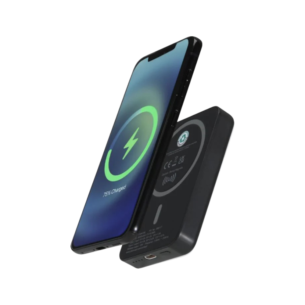 Stay charged in style with this 5000 mAh Magnetic Wireless Power Bank, a compact and sustainable accessory crafted from recycled ABS plastic. It offers up to 15 W of magnetic wireless charging for compatible smartphones (iPhone 12 and newer), and includes a metal ring for seamless alignment with non-magnetic devices. When paired with wired charging, its 20 W USB‑C fast charge capability ensures you’re powered up quickly and conveniently. An LED indicator keeps users informed of battery levels, making it perfect for on-the-go charging needs.